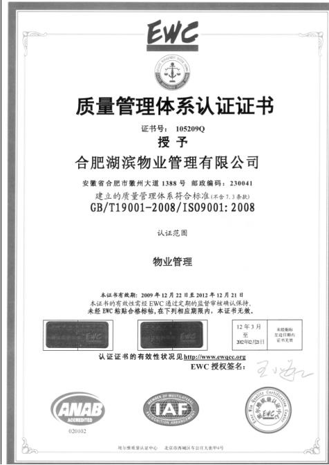 自导入ISO9001:2008质量治理系统以来,,,湖滨物业公司就将系统认证事情作为完善机制、提升企业竞争力的主要行动。。。。。通过质量治理系统认证,,,制订标准化、规范化的物业品牌治理标准,,,将效劳历程的每一项流程、效劳都形陋习范化。。。。。